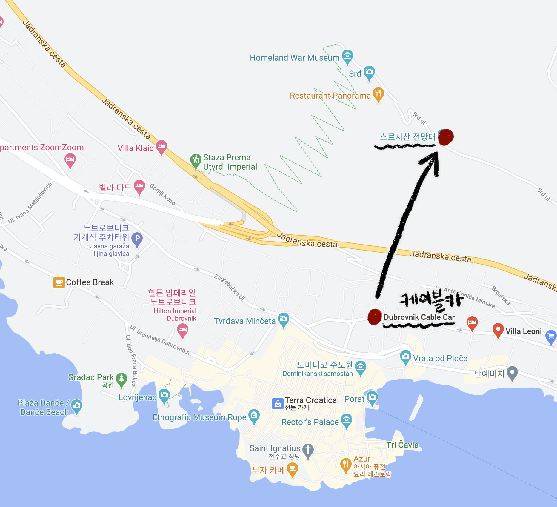 올드타운에서 케이블카 타는 곳까지는 Pile이나 Ploče gates에서 갈 경우 걸어서 8~12분 정도 소요되며, Stradun에서 갈 경우 6~9분 정도 소요됩니다. Stradun에서 가는 루트가 시간은 조금 덜 걸리지만 계단이 가파라서 힘들다고 하니 어린 아이나 어르신을 동반한 경우에는 시간이 더 소요되더라도 Pile쪽 루트를 추천드립니다. Gtuž hatbour(항구)쪽에서 가는 경우 동편 끝에서 8번 버스나 택시를 통해 이동할 수 있습니다. 케이블카 아래쪽 입구까지 약 4~5km 정도 됩니다.