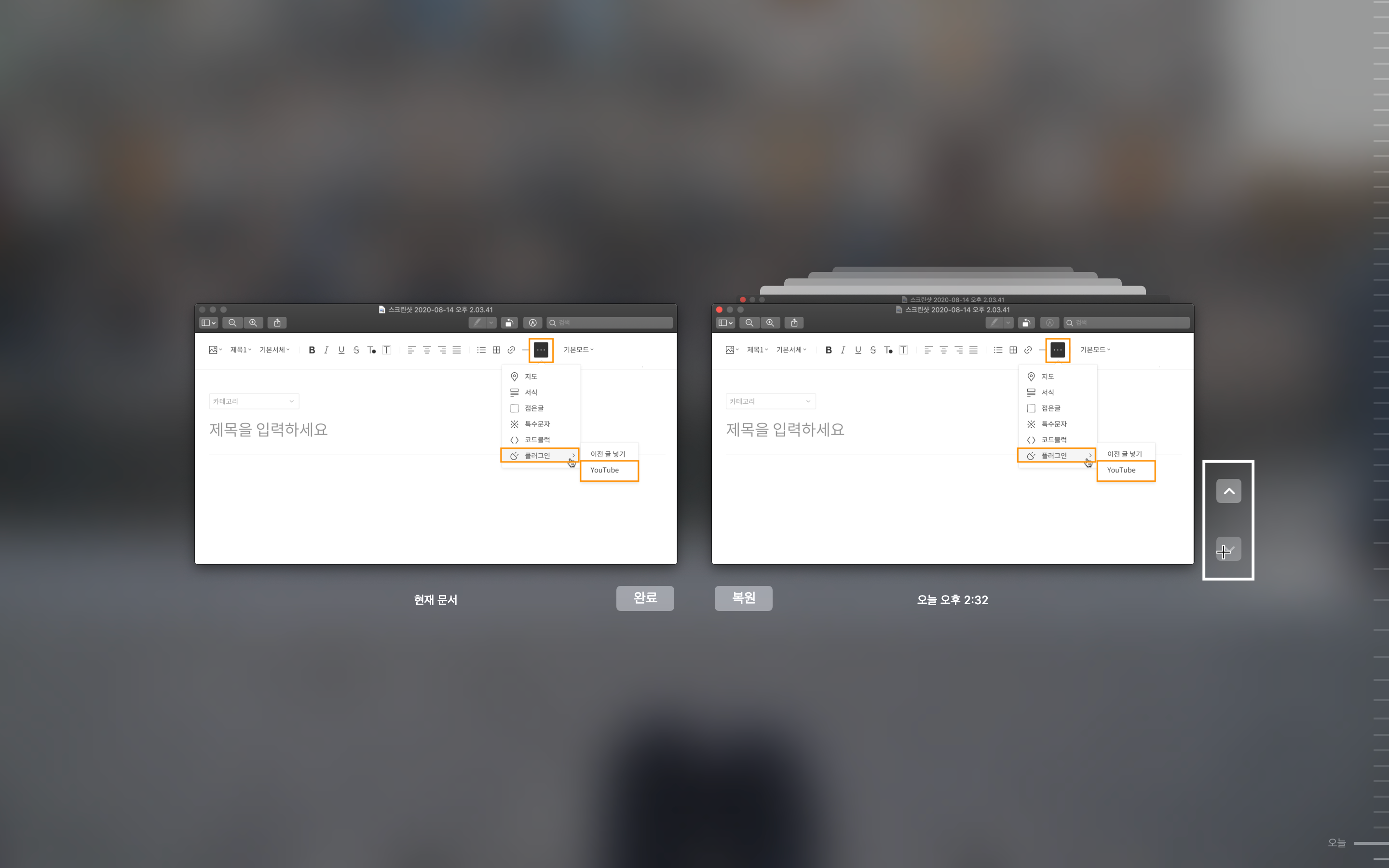 원하는 버전을 클릭하면 사진이 커지는데, 복원을 눌러주시면 됩니다.