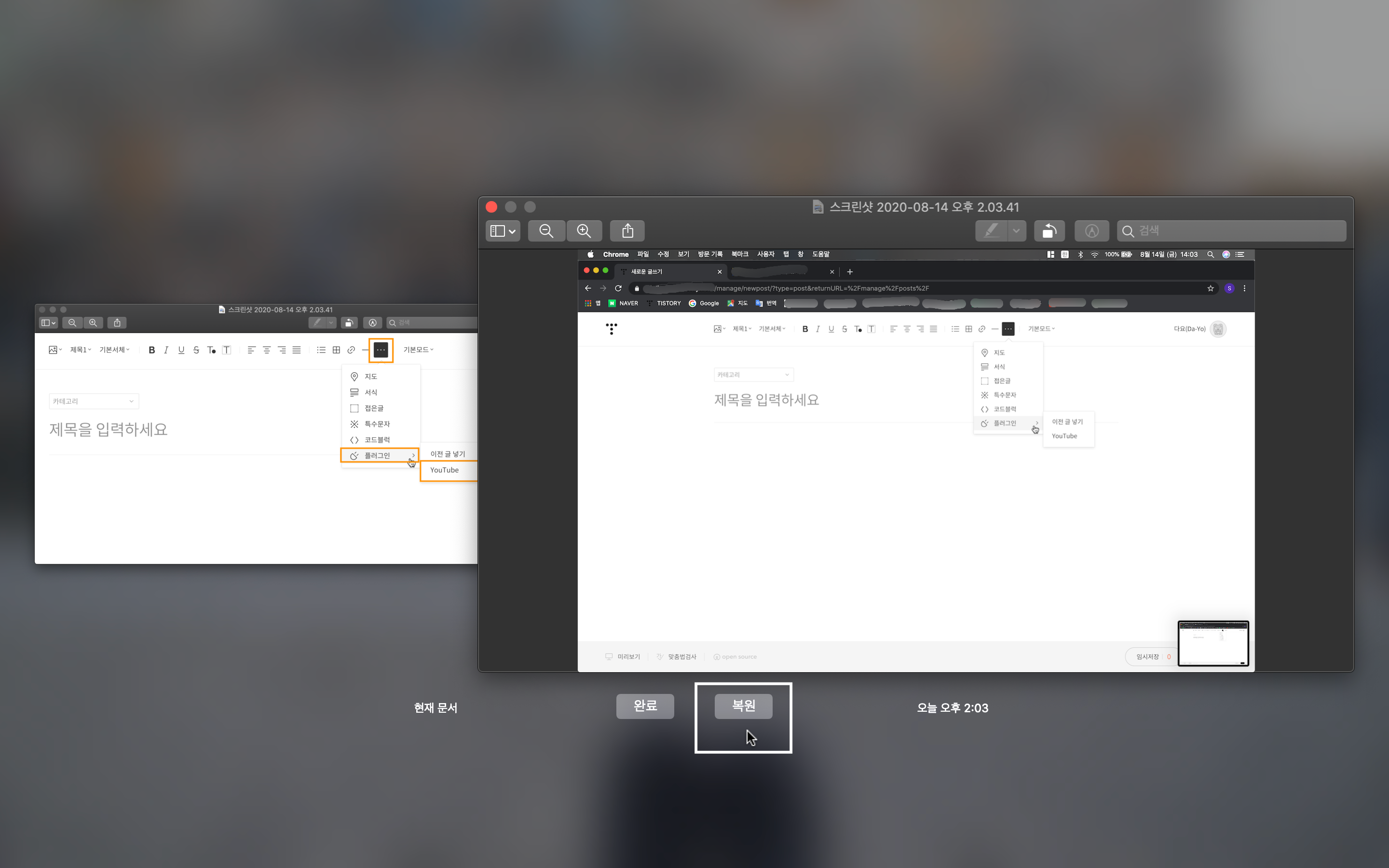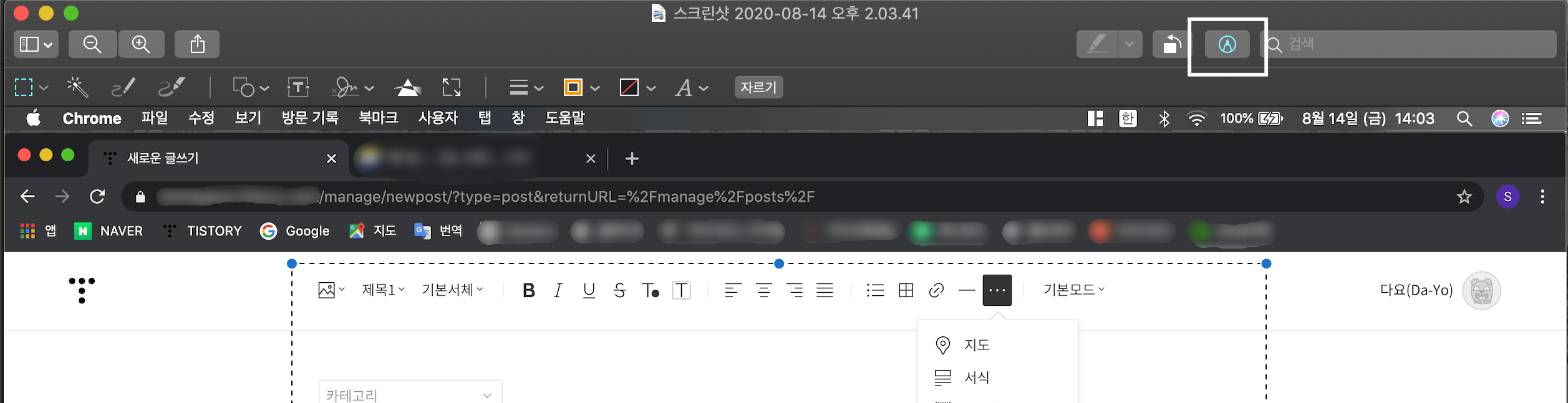 저는 스크린샷과 간단한 표기 정도 하는 티스토리 설명글은 미리보기만으로 작업하고 있습니다.