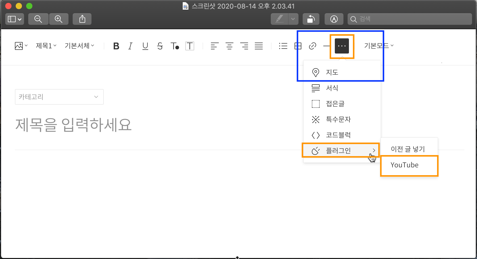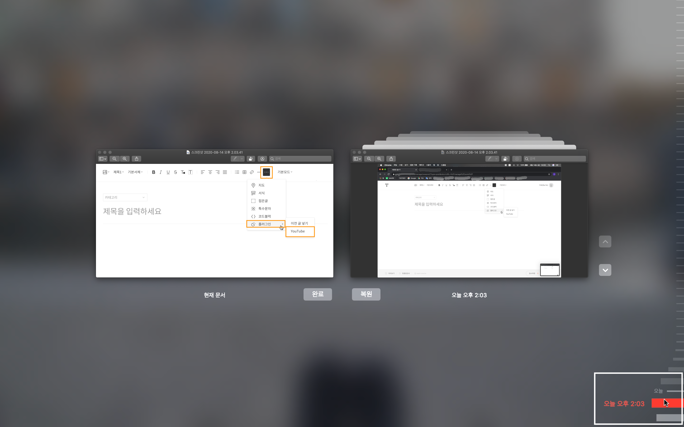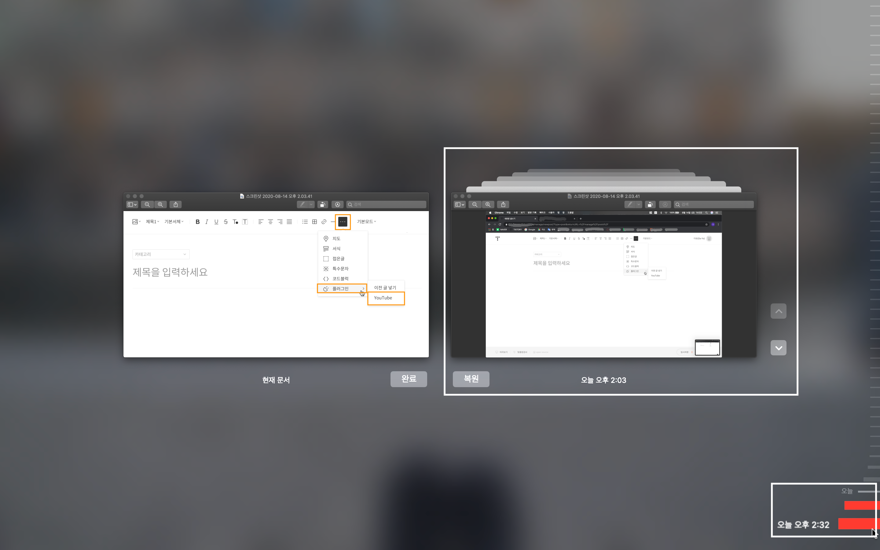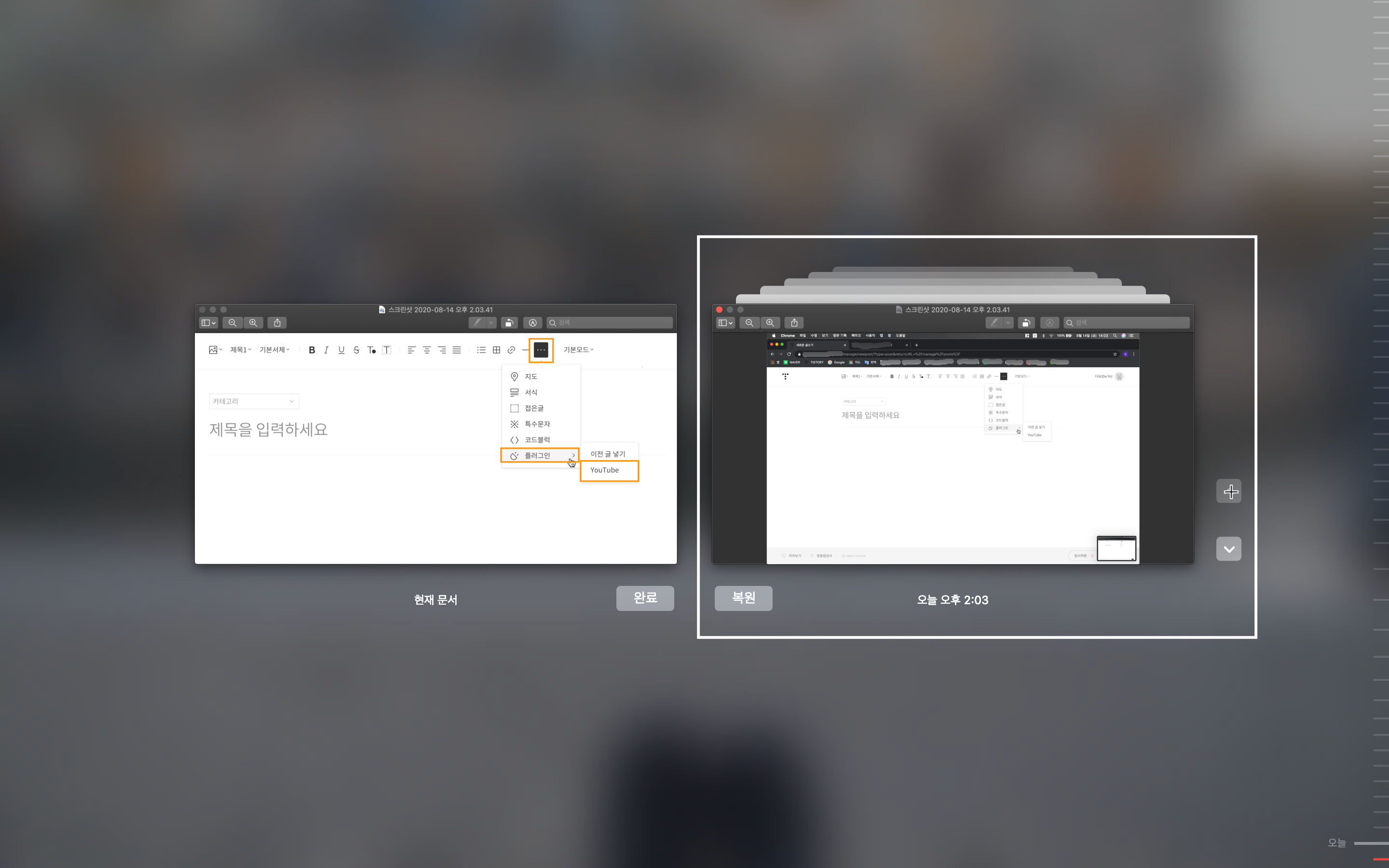 티스토리 블로그에 유튜브 영상 넣는 방법을 설명하기 위해 찍었던 스크린샷입니다.