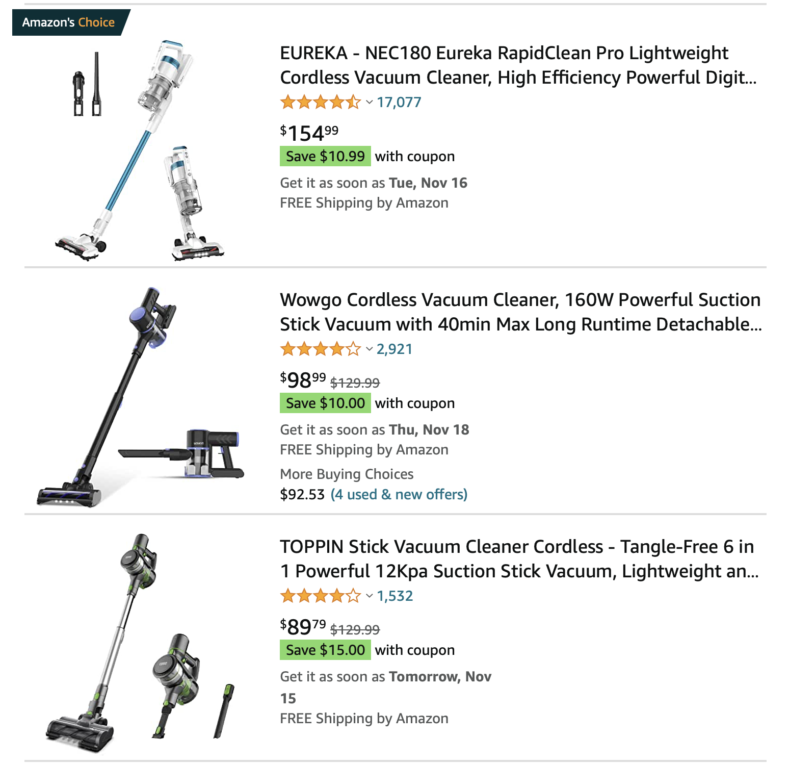6. 무선청소기: 한국과는 달리 정말 다양한 브랜드에서 출시된 제품들이 많아요. 세일도 많이 하고 10만 원 이하고 구매 가능한 제품도 많으니 후기 찾아보시고 골라잡으시는 것도 추천드립니다.