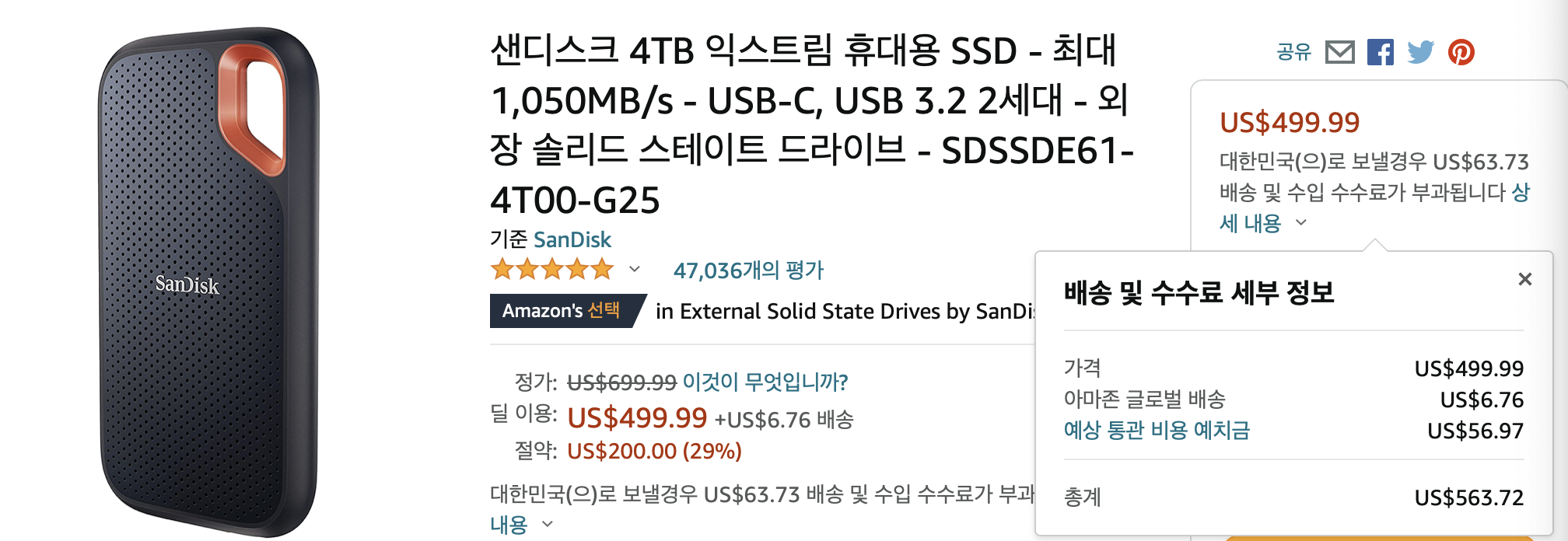 샌디스크 익스트림 SSD같은 경우 699.99달러짜리 제품을 배송비+관부가세 다 합쳐서 563달러에 구매할 수 있다면 5~6만 원 정도 절약할 수 있는 셈이에요. 하지만 국내에서 구매하면 80만 원 정도 지출해야 하니 20만 원이나 이득이죠(그만큼 국내 가격 거품이 심해요). 아마존 블프세일 기회를 놓치면 안 되는 이유입니다.