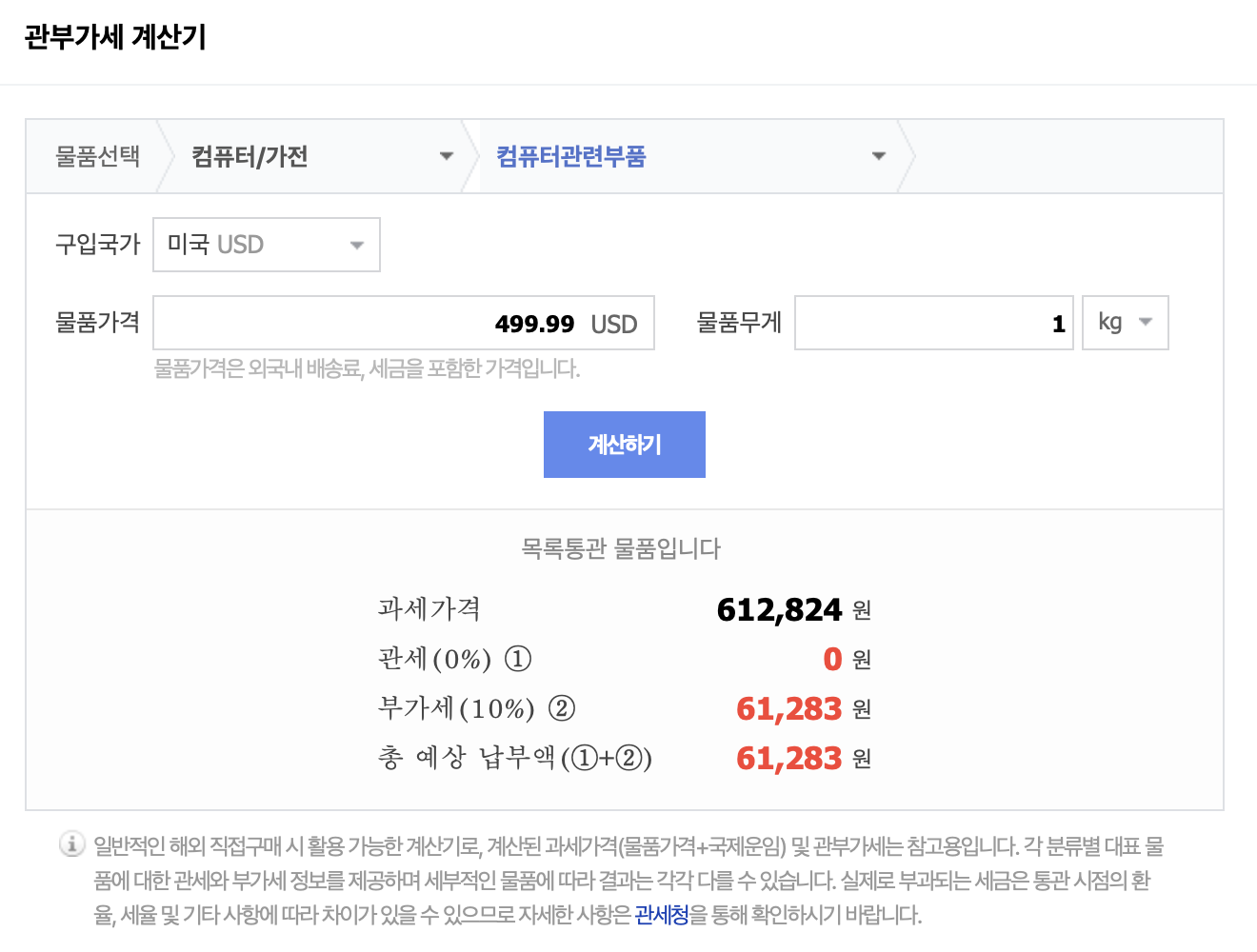 배송배행지가 필요 없는 해외배송을 지원하는 셀러의 경우 우측 상단 가격표시 아래에서 상세 내용을 확인해볼 수 있습니다. 위의 사진을 보시면 아마존 글로벌 배송비는 6,76달러로 만원 이하에 직배송을 받을 수 있고, 국내에서 통관 시 예상되는 비용을 미리 계산하여 알려주고 있어요. 네이버 관부가세 계산기로 계산한 예상 비용과 크게 다르지는 않았습니다.