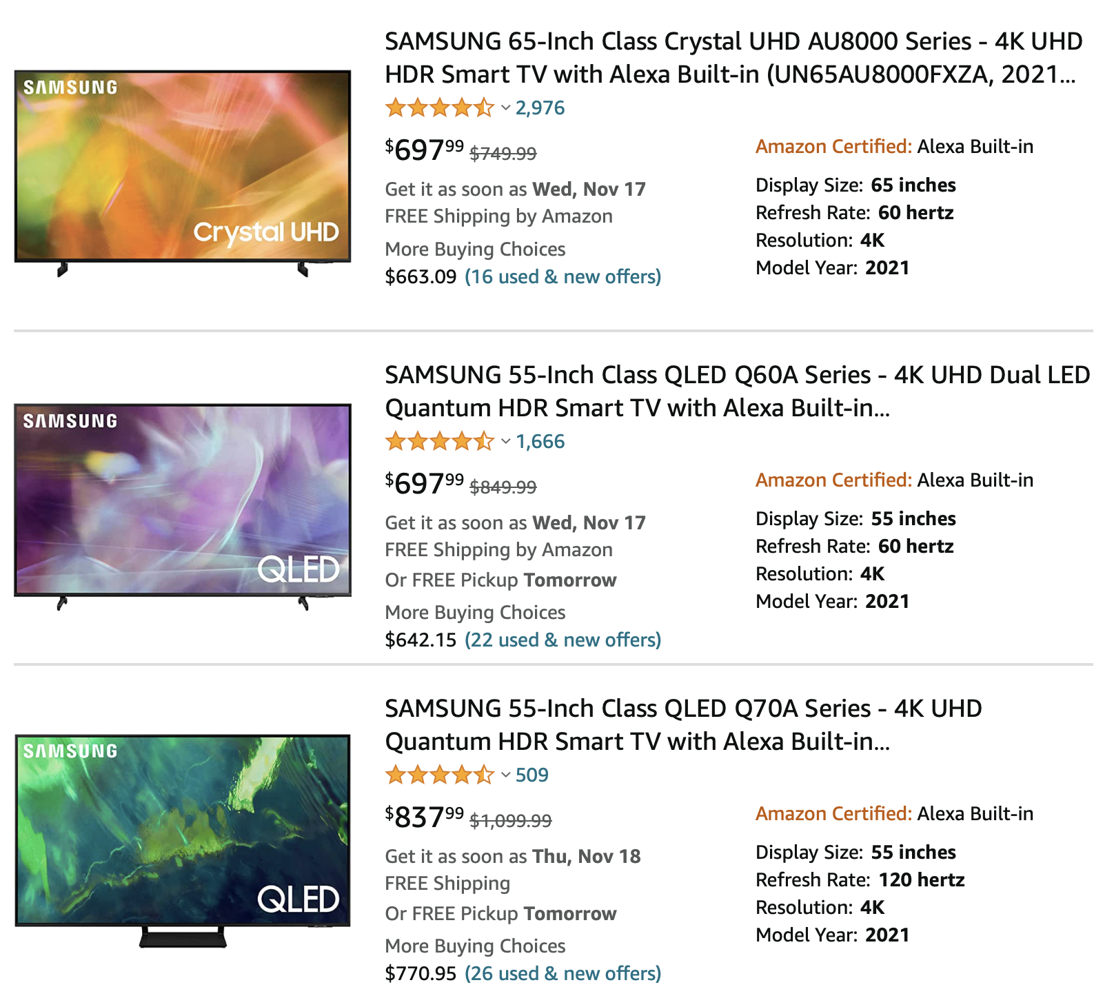2. 삼성 TV: 의외로 국내와 해외 가격차가 있는 품목이라 역수입 많이 하는 품목이에요. AS는 어렵겠지만 가격이 매력적이에요. 벌써 200달러씩 세일중입니다.