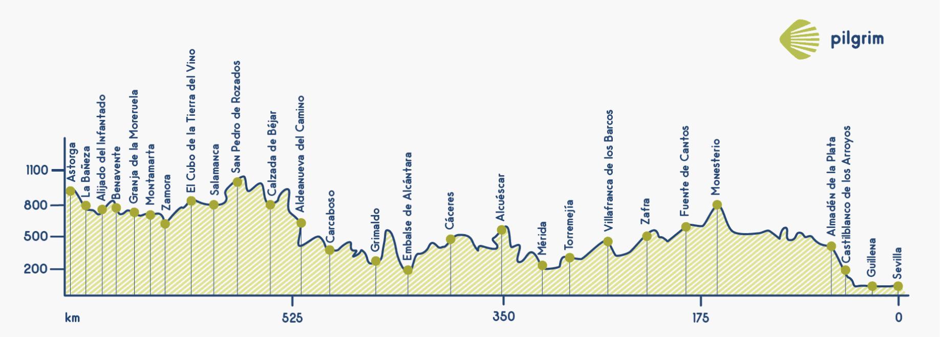 은의 길은 세비야(Sevilla)에서 시작되는 960km의 길이다. 과거 로마제국의 주요 도시였던 지역을 지나는 루트로 볼거리가 많다는 것이 특징이다. 중간에 Astorga에서 카미노 프린세스 길로 합류하여 산티아고로 향하게 된다. 도보로 약 33일 소요된다.