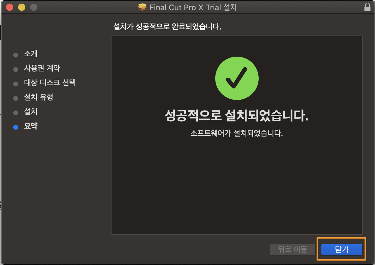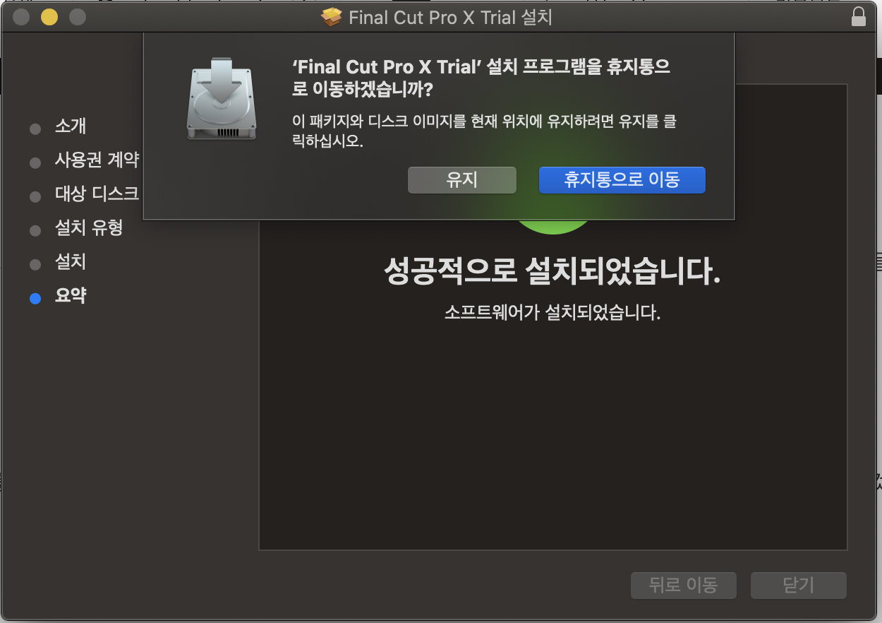 설치가 완료되어 창 닫기를 누르면 설치 프로그램을 휴지통으로 이동할 거냐고 묻는데