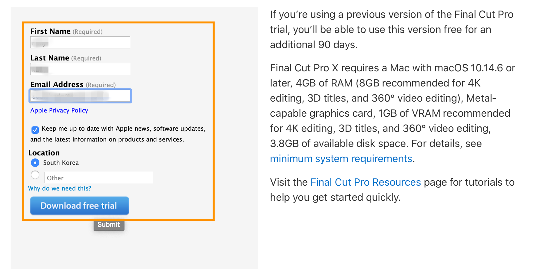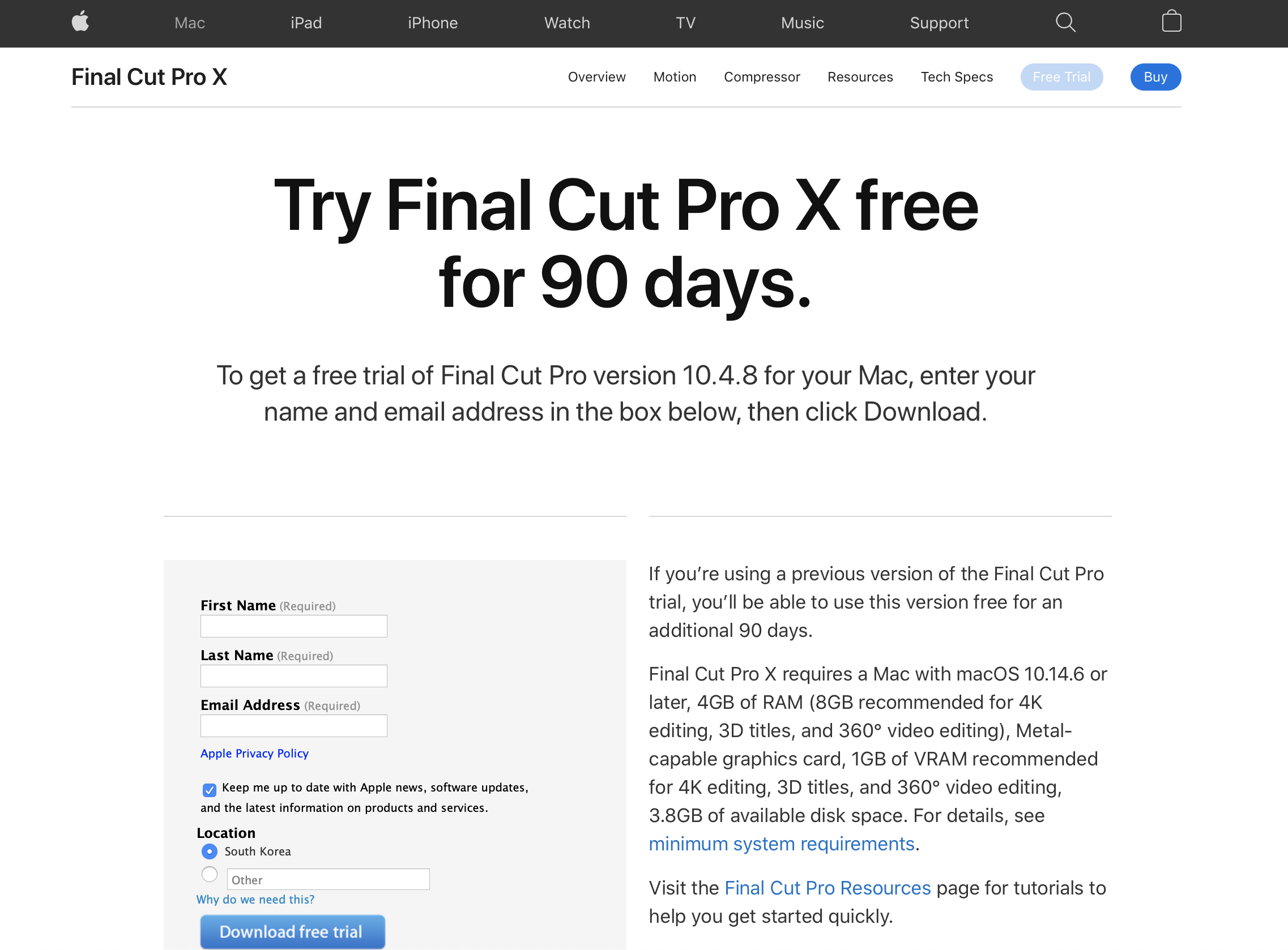 먼저 아래 링크를 통해 파이널컷 다운로드 사이트에 접속합니다.