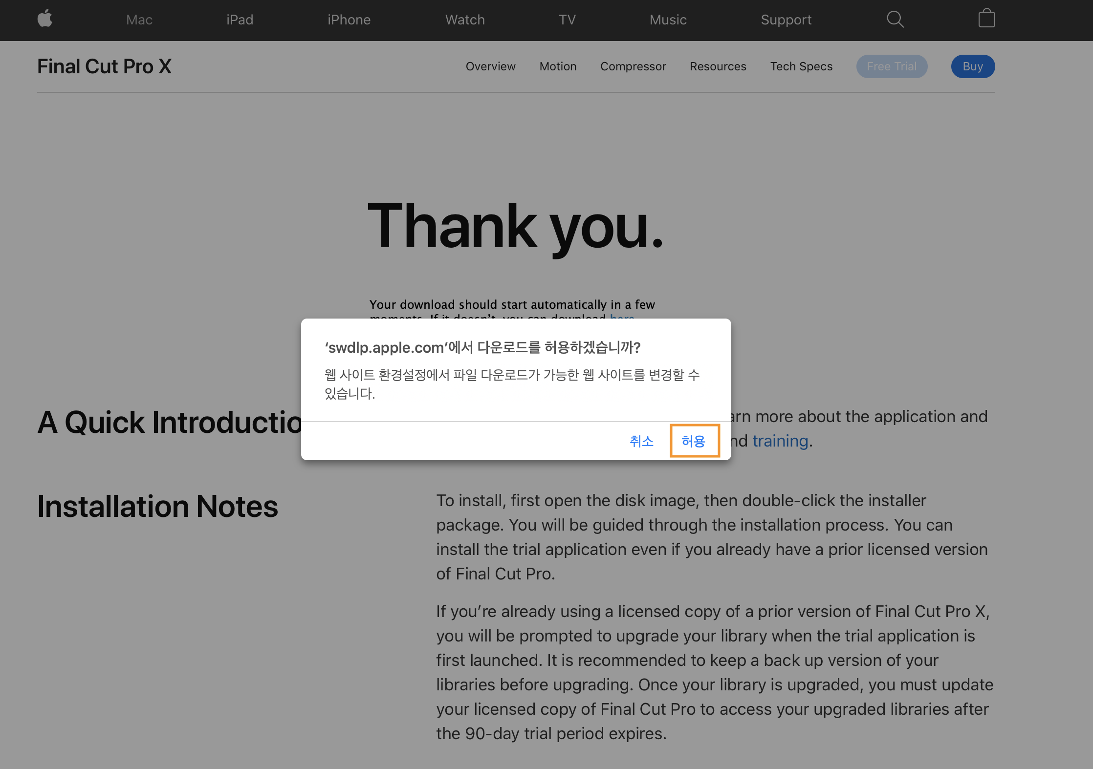 그러면 애플 홈페이지에서 다운로드를 허용하겠냐는 창이 뜨는데 허용을 눌러줍니다.