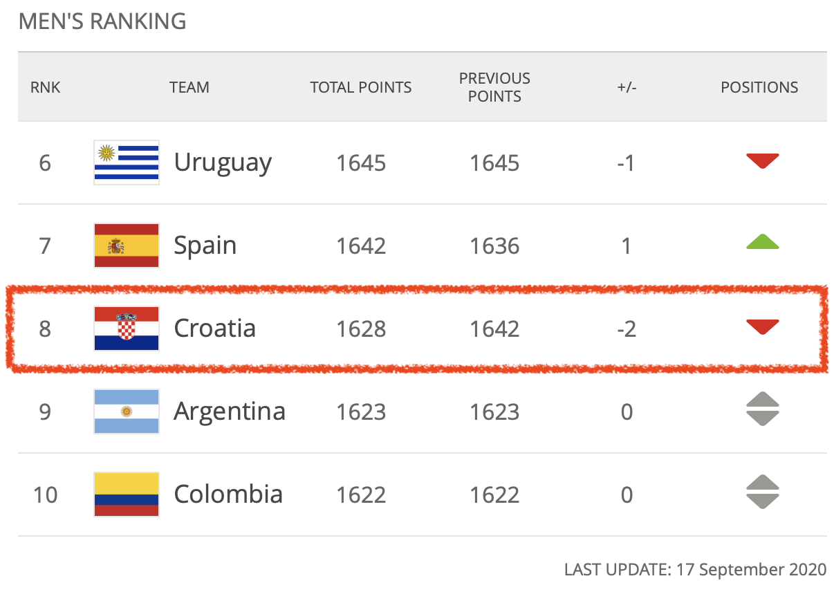 2020년 크로아티아는 2월부터 계속 6위를 유지해오다 9월 두 단계 떨어진 8위에 랭크되어있다. 2020년 8월 프랑스에 1:2로 패하였고, 8월 11일 스웨덴에 2:1로 승리하였으나 9월 8일 프랑스에 2:4로 패하였다.