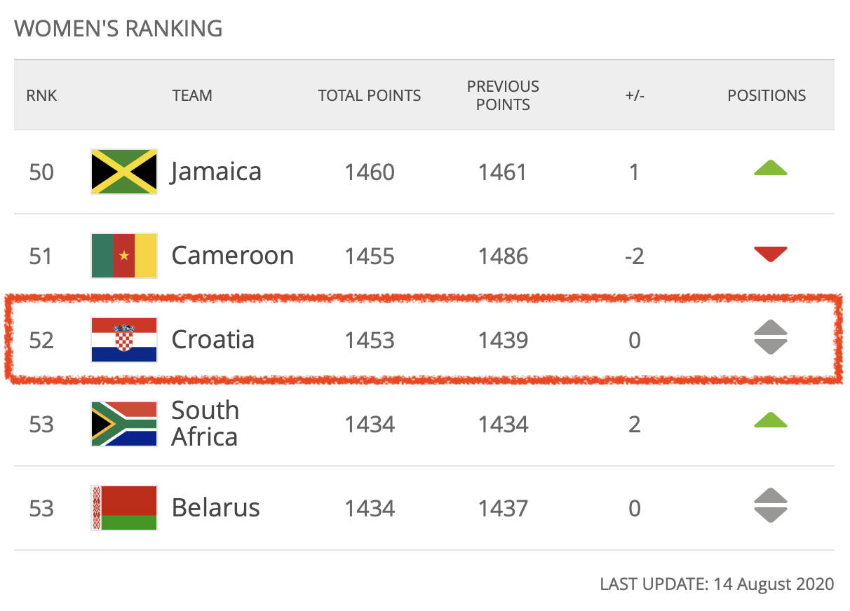 크로아티아 여자 피파랭킹은 40~60위권을 지켜오다 2019년부터 2020년 8월까지 피파랭킹 52위를 유지하고 있다.