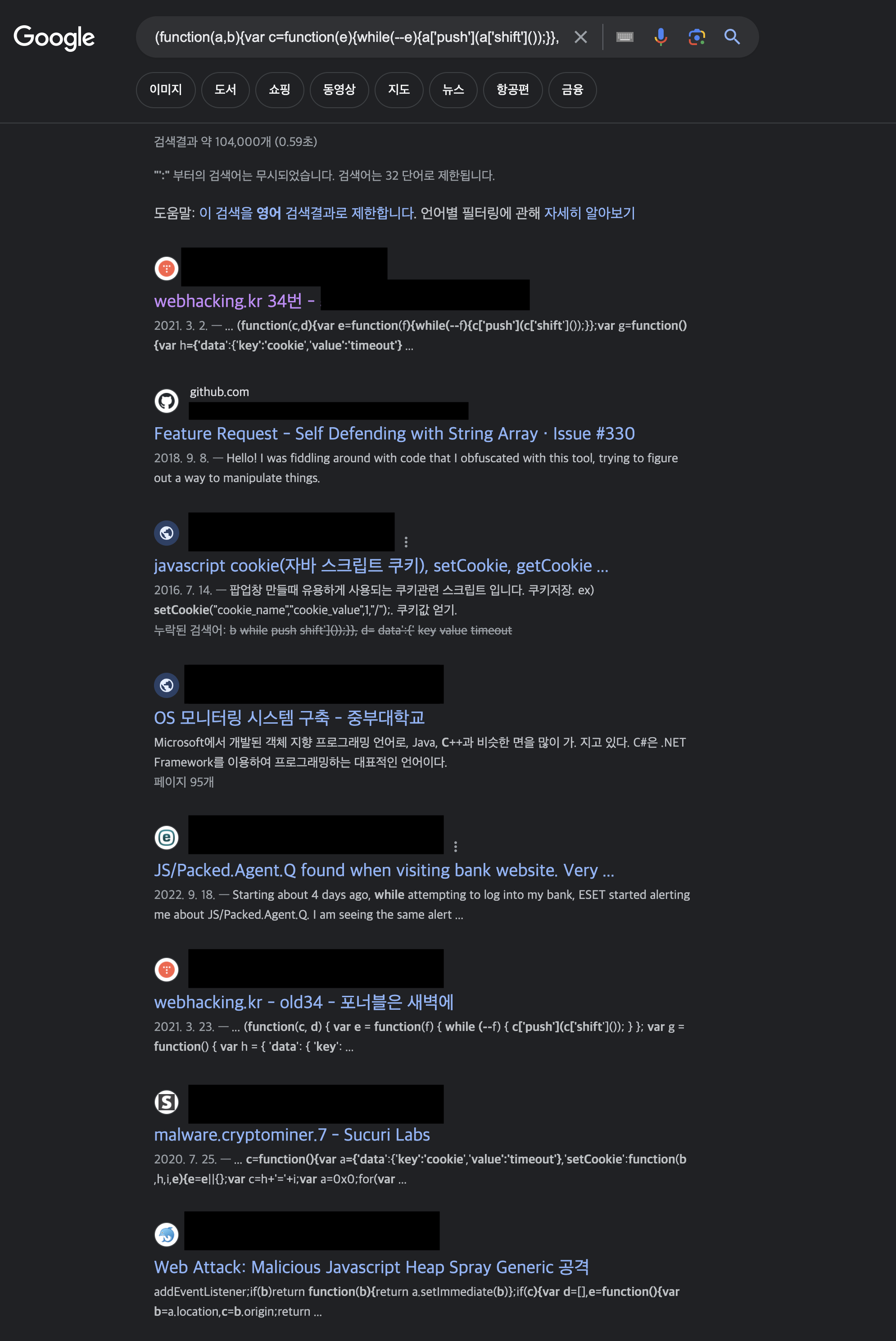 그래서 단락단락 복사해서 검색해 봤는데 뜨는건 webhacking.kr이라는 웹해킹을 공부하는 사이트에서 출제된 34번 문제(?!) 멀웨어 등등 해킹 관련한 내용들이 좌라락 뜨네요. 팝업창 만드는 코드라고도 하고. 맙소사 그냥 스쳐가는 블로그에 이게 무슨 일이죠?
