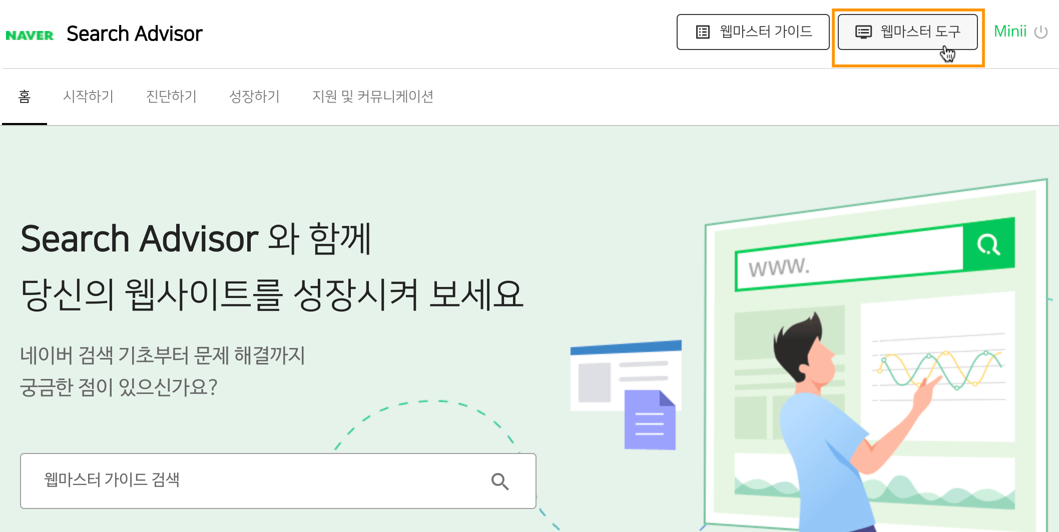 이름이 네이버 서치 어드바이저로 변경되었는데, 여기로 들어가시면 웹마스터 도구가 나옵니다.