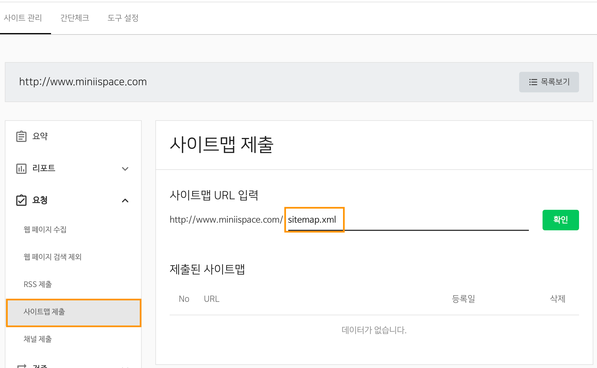 요청 > 사이트맵 제출로 이동해줍니다. 우측에 사이트맵 URL 입력이라는 메뉴가 있는데, 사이트맵 주소를 입력해줘야 해요.