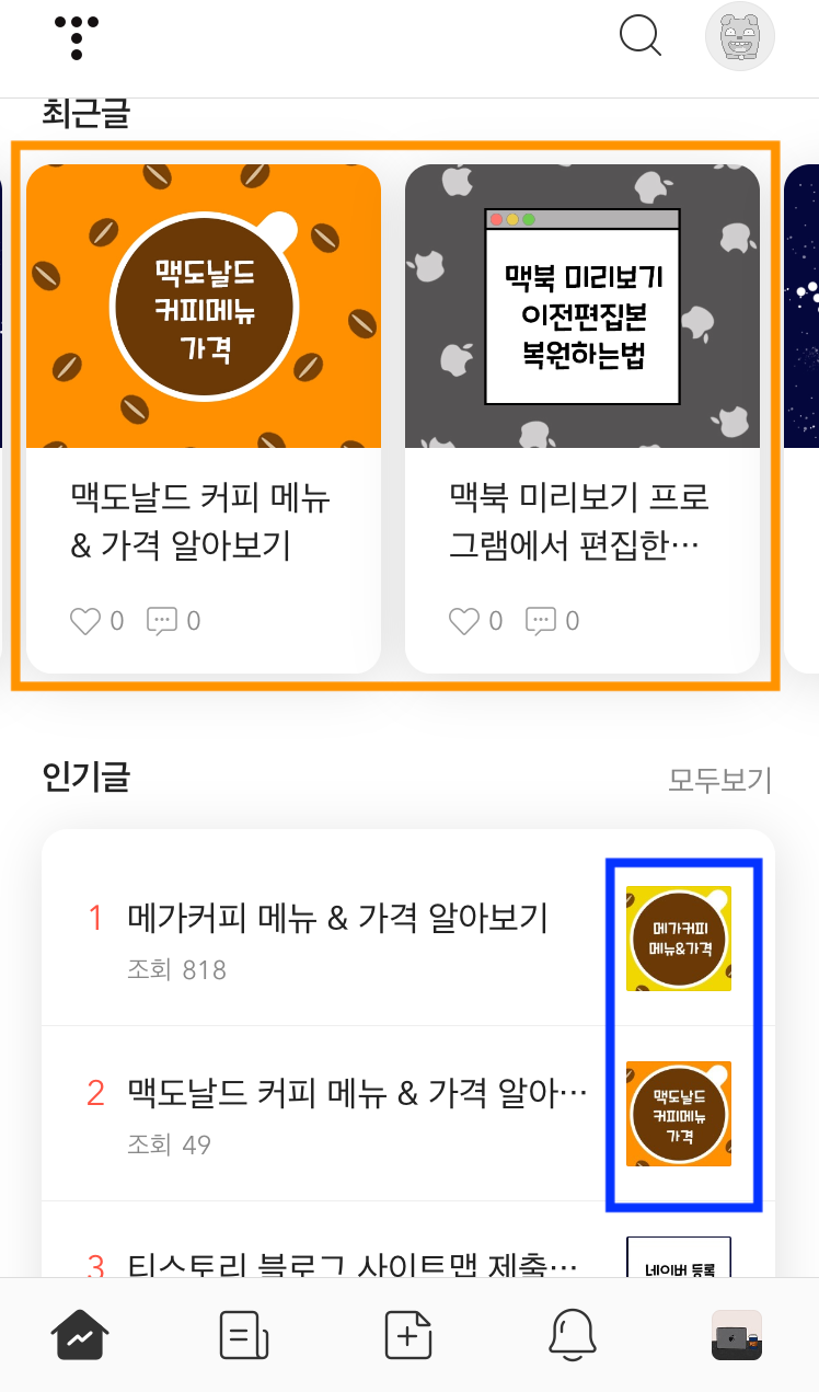 특히 블로그 앱에서만 보면 외곽부분이 다 잘려나가서 그렇게 보기싫더군요. 최근 글 보기는 직사각형형태, 모두 보기는 정사각형인데 정사각형의 중앙부분만 보여주기 때문에 상당히 불만족스럽게 느껴졌습니다.